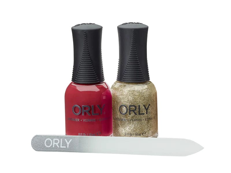 Introducing the ORLY Deluxe Sapphire Collection Gift Set. This luxurious velvet sapphire cosmetic bag contains two of our best selling 18ml vegan nail polishes, ORLY Heart of Adventure red crème polish and ORLY Jungle Boogie gold glitter polish. Our products are 100% vegan and cruelty-free, and the nail polish is packed with pigment for perfect two-coat coverage every time. Plus, our patented ORLY Gripper Cap makes opening the bottle easy. This limited edition set is only available while stocks last.